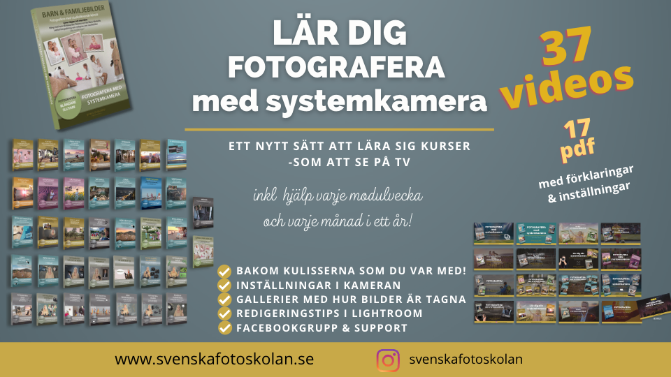 Den stora kursen med videos som att hänga med bakom kulisserna och lära sig genom 37 videos, blandat med fototips och redigeringar. Till din hjälp har du även 17 PDF med instruktioner och fotouppgifter, samt support med livesändningar och exklusiv Facebookgrupp som tar dig framåt i ditt fotograferande!